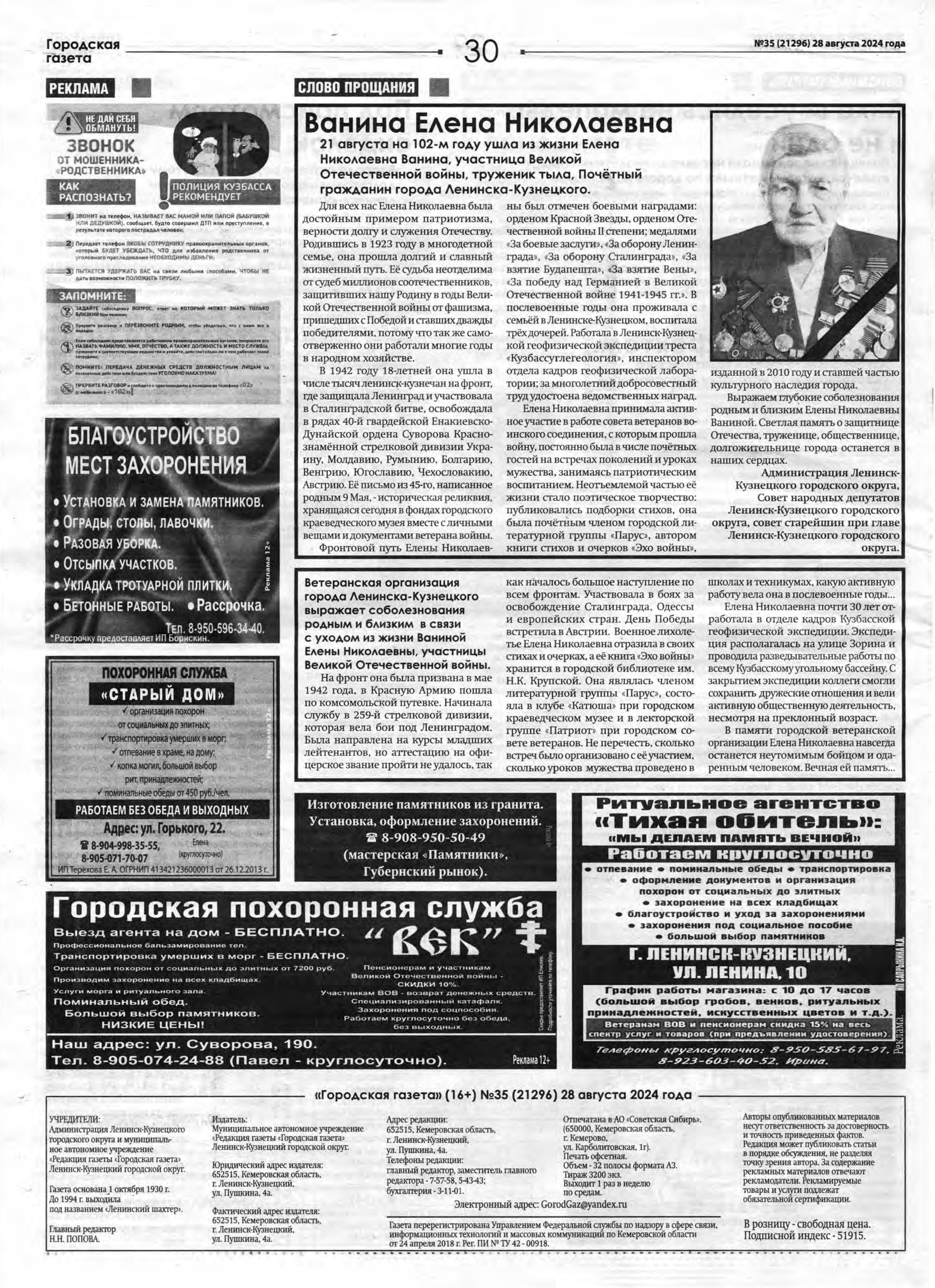 Ушла из жизни Елена Николаевна 21 августа 2024 года на 102-м году жизни. Похоронена на городском кладбище Ленинска-Кузнецкого (участок №10).